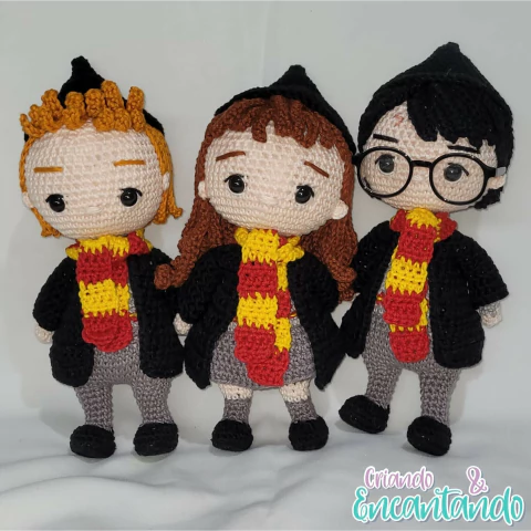 3 Bonecos dos personagens principais dos filmes e livros de Harry Potter, Rony Weasley, Hermione Granger e Harry Potter.